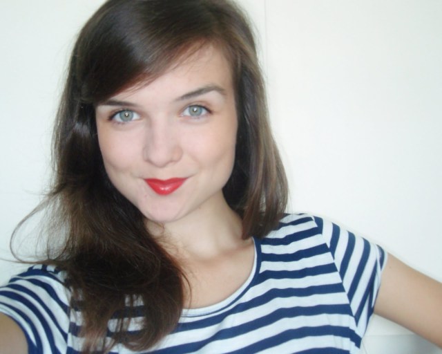 Biele nohavice, modré prúžky na tričku a červené pery (teda aj topánky, ale sústreďme sa na tie pery)