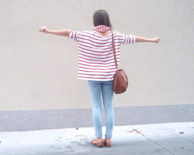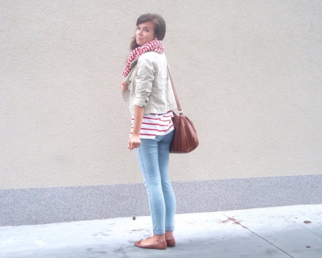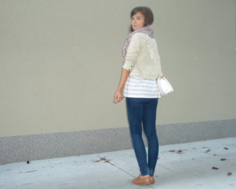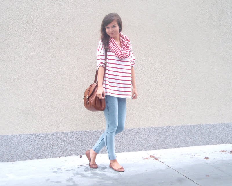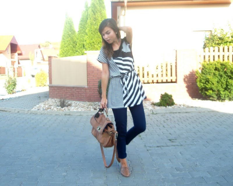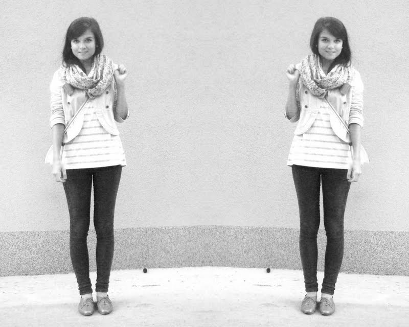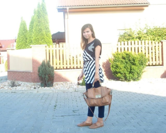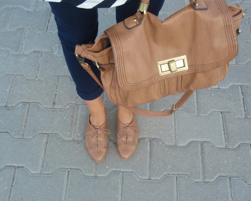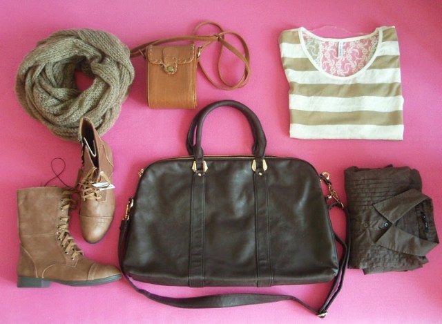 Kruhový šál pretože tie kruhové sú úplne najlepšie. Už to bude tretí rok čo ich nosím a neviem si ich vynachváliť. Tak prečo nerozšíriť zásoby. Tá maličká kabelka mi pripomína tašku na foťák. Tak už si iba zadovážim ten foťák a budem úplne spokojná. Nejaký top s čipkovaným chrbtom som chcela už dávno. A keď som narazila na tento. Pruhovaný. Krátky. A v absolútnej zľave za 1e. No nekúp to! Vyzerá skvele s jednoduchým tielkom pod ním napríklad. Bagandže boli tiež v akcii. V Tescu. A keďže mám už jedny podobné. Svetloružové. Hnedým som jednoducho neodolala (keďže hnedá je v poslednom čase môj favorit). Obria kabelka bola láskou na prvý pohľad. Na dovolenke v Taliansku. A (ako asi všetky moje kabelky) má tiež svoju story, ktorá nakoniec skončila happy-endom. Takže sa z nej naozaj teším. Je priestranná, úplne jednoduchá, diplomatická (ako ju ja nazývam) a celkom dosť dokonalá podľa mňa. A nakoniec košeľa. Tú mám síce už asi tri roky, ale do tejto hnedej nálady sa mi úplne hodila. A taktiež nesmieme zabúdať, že rôzne variácie na límce a golieriky ma začínajú baviť čoraz viac.