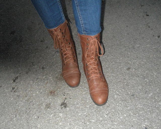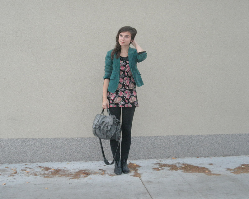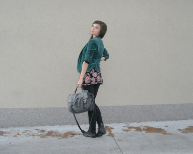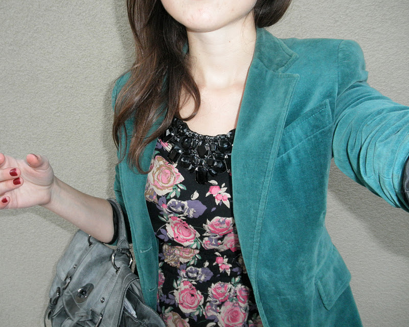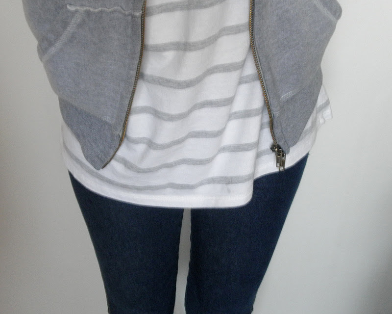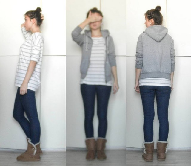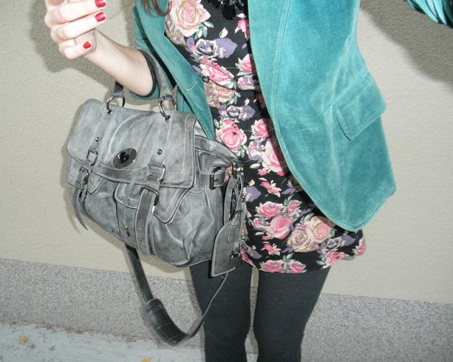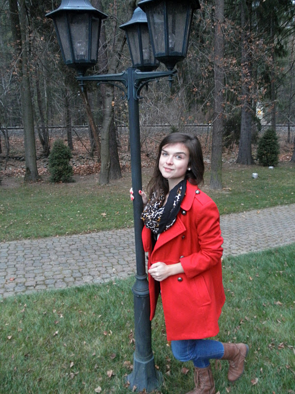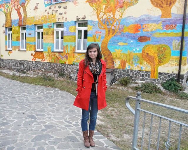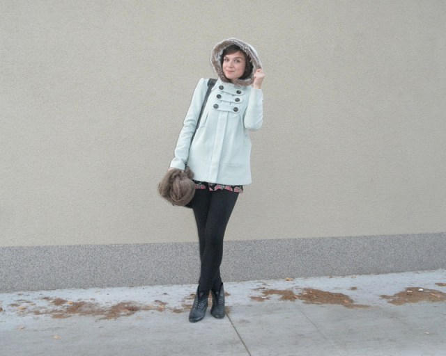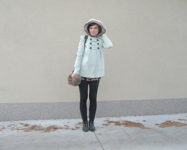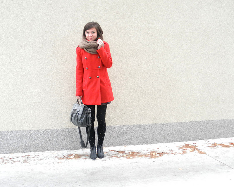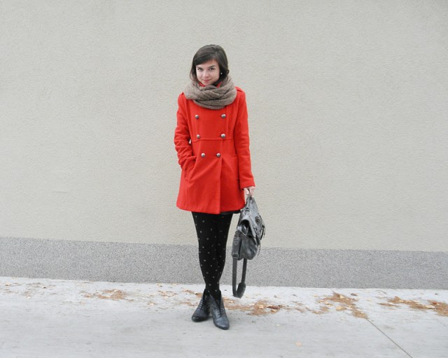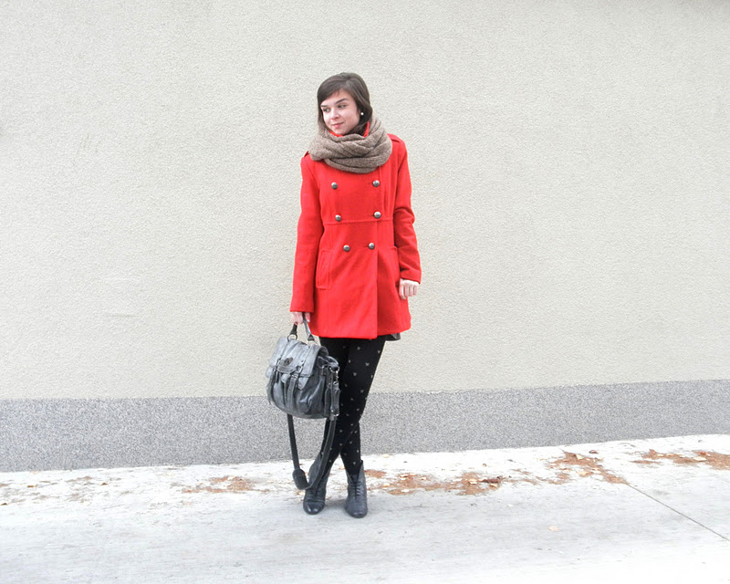kabát (F&F), jeggins(Next), sveter(H&M), šatka – secondhand / tričko-NY / bagandže-F&F