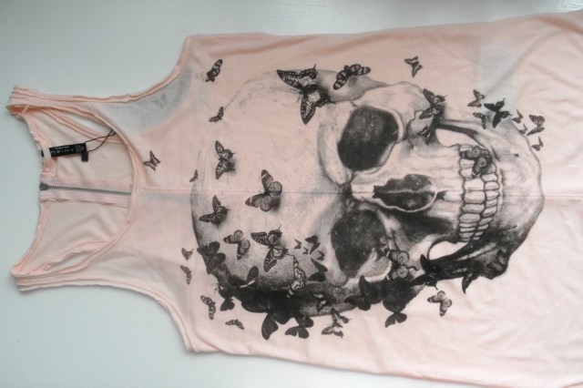 Podobný kup ako plavky. Za smiešny peniaz v NewYorkeri. Lebky nie sú úplne môj štýl, ale tie motýliky, svetloružová farba a zips na chrbte ma presvedčili. A bude skvelé len tak na plavky, či?