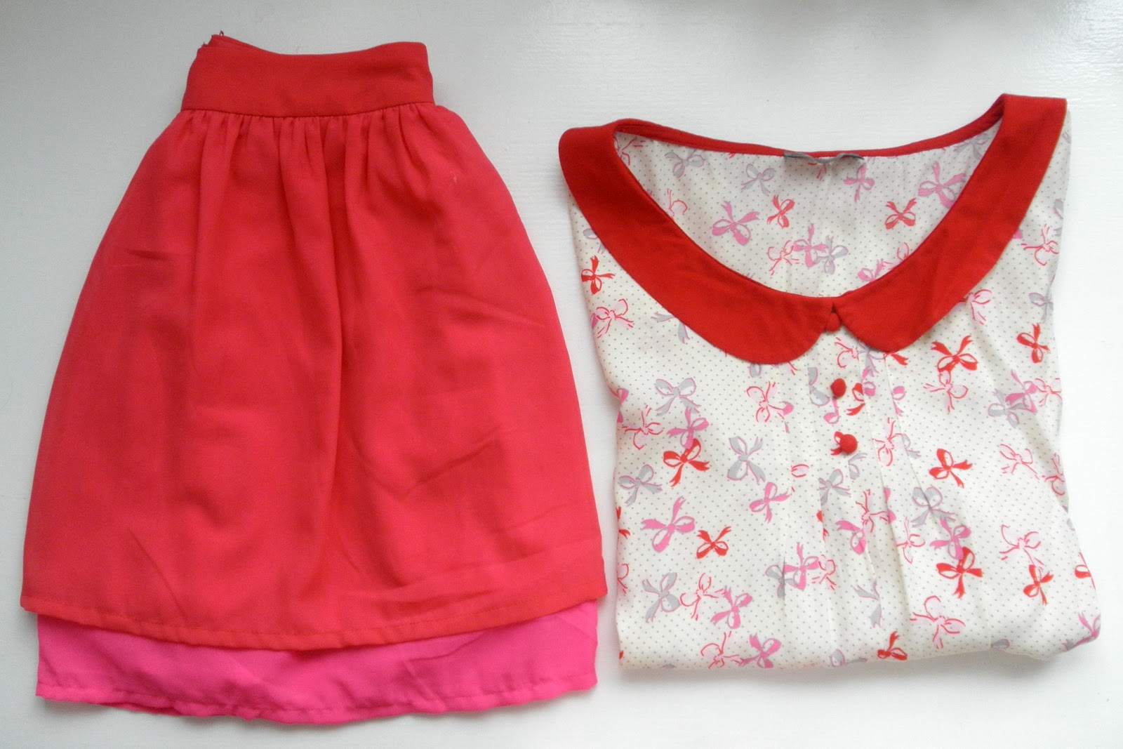 Ružová sukňa s neónovou spodničkou z háemka je super vzdušná a parádne sa točí! A mašličkový top s červeným golierikom je rozkošník. Zo sekáča.