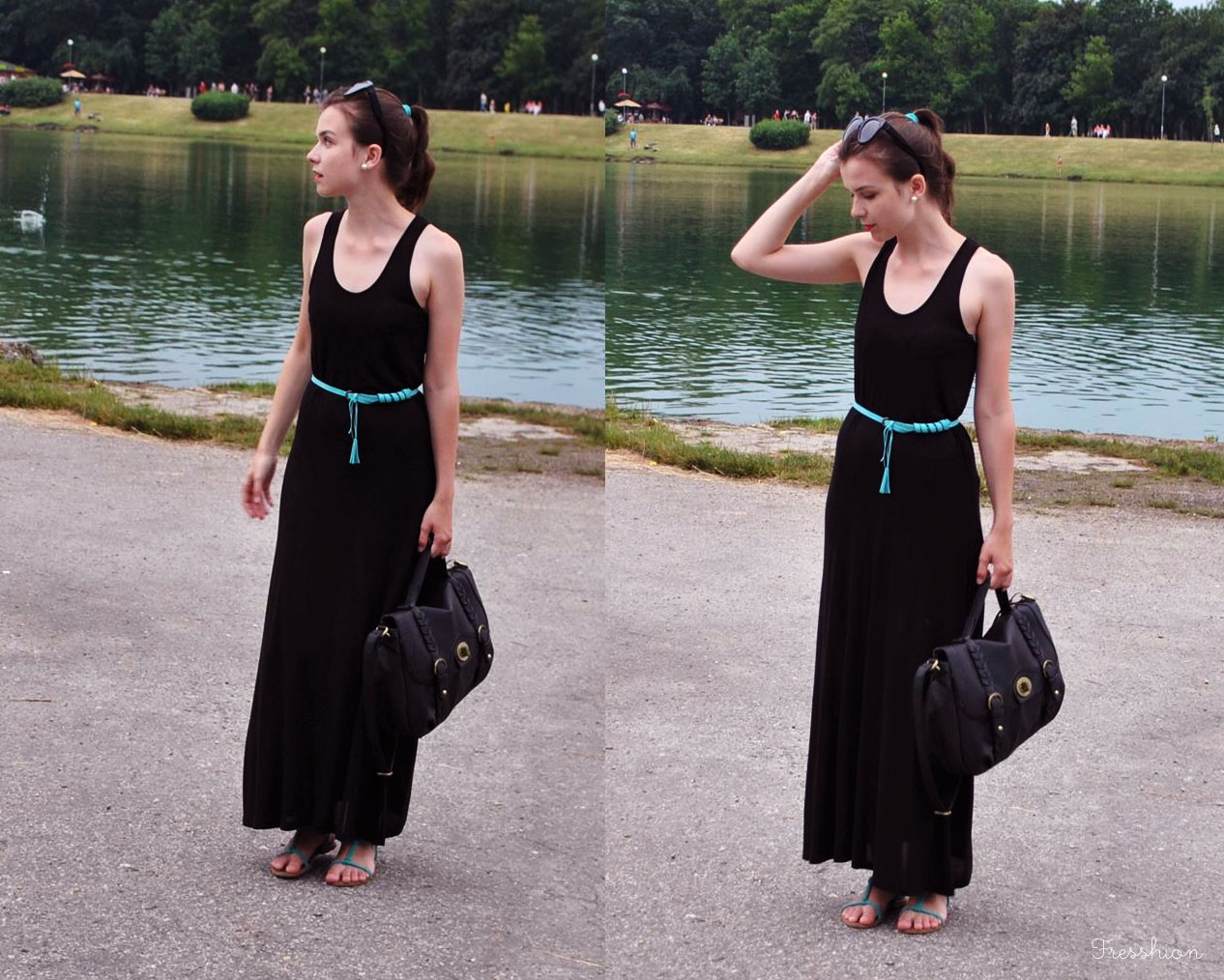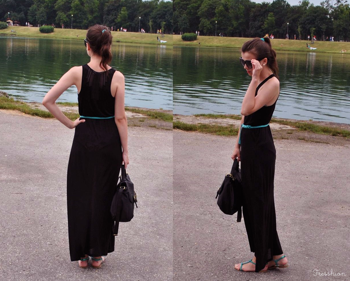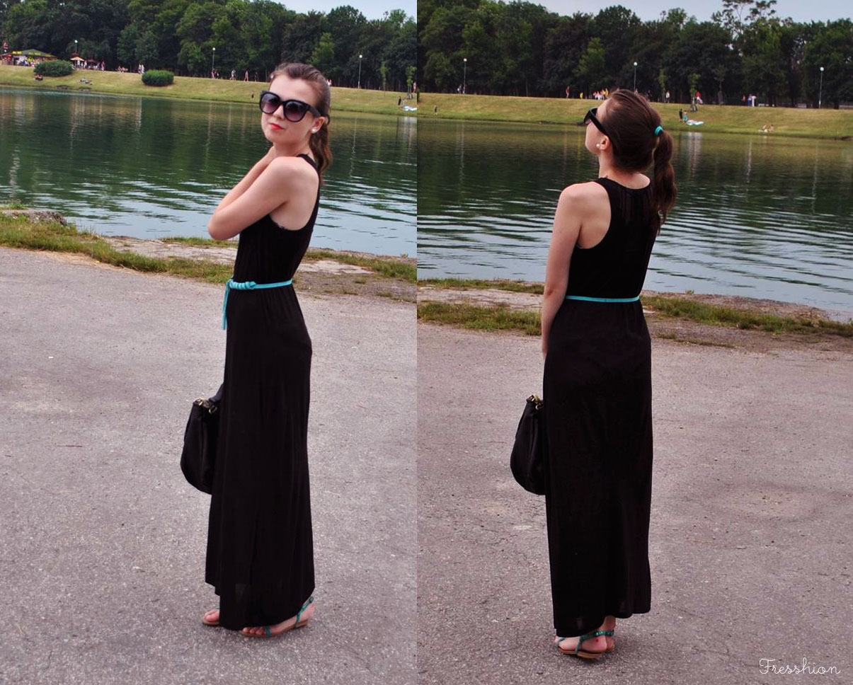 Nikdy som si samu seba nepredstavovala v takýchto šatách. Jednoducho niečo čierne a siahajúce až po zem vôbec nezapadá do môjho štýlu. No po rozhovore s kamarátkou o tom, ako zháňa dlhú sukňu a stále nevie nájsť tú pravú, som si spomenula na tieto šaty. Kúpené pred rokom v sekáči za smiešnych 50 centov (nové s visačkou!) a odvtedy pochované v hlbinách skrine. Úplne som na ne zabudla a myslela som si, že keď ich nájdem, vôbec sa mi nebudú páčiť. No opak bol pravdou a keď som si ich obliekla spolu s tyrkysovým opaskom a sandálkami, cítila som sa až prekvapivo dobre. Veľmi sa mi na nich páči ten priesvitný detail na chrbte a tiež zisťujem, že dlhá sukňa je asi najúčinnejšia ochrana pred komármi. Viem, že by to chcelo nejakú menšiu kabelku (mmm…také tyrkysové psaníčko by vôbec nebolo zlé), no boli sme sa kúpať, takže pod šatami mám plavky a v kabelke uterák, knihu a opaľovací krém. No a hádajte aký mám vzťah k dlhým šatám/sukniam teraz? Túžim už pár dní po nejakej takejto!