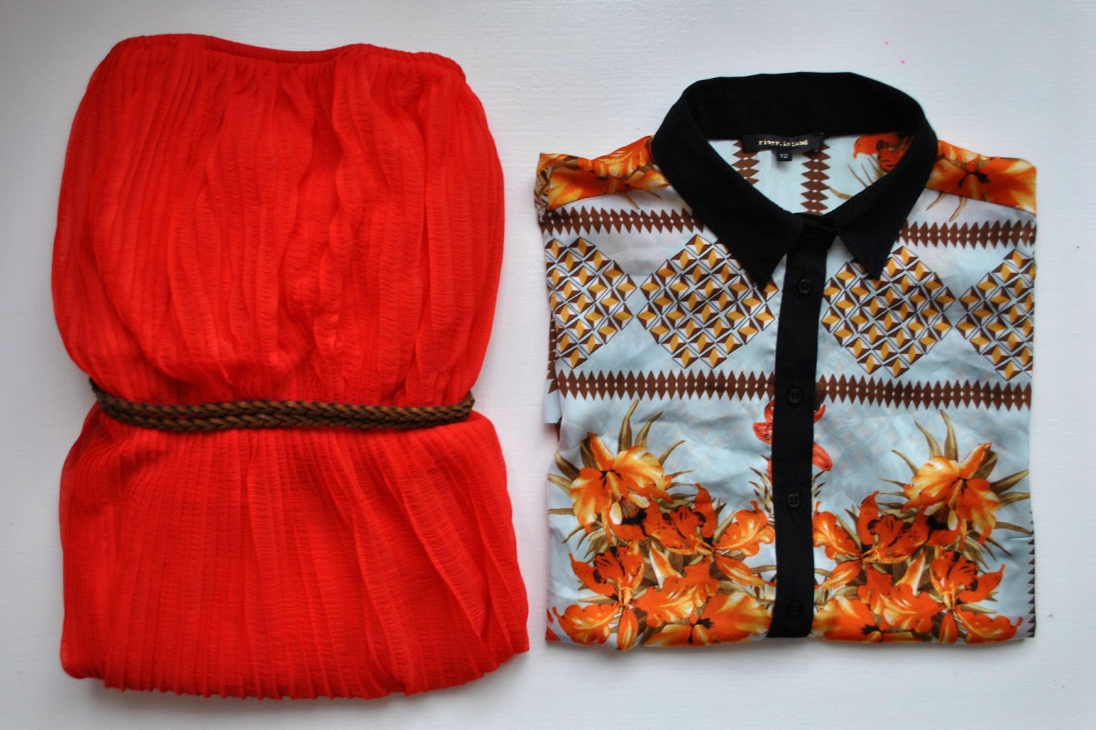 Ďalším kúskom sú červené plisované šaty pôvodne zo Zary. Už aby bol zase nejaký teplý letný večer nech ich vyvetrám kým som ešte opálená. Sú tiež (ako asi väčšina vecí, ktoré som si teraz kúpila) príjemne vzdušné a pekne vlajú vo vetre. Najviac sa mi páčia doplnené tenkým hnedým pleteným opaskom. Takto poskladané ale nevyzerajú bohvieako, tak dúfam, že sa mi podarí odfotiť outfit s nimi, nech ich vidíte v plnej kráse. Posledným sekáčovým úlovkom je saténová blúzka s motívom, ktorý mi pripomína šatky. Je vzadu dlhšia, tak ako to mám veľmi rada a tiež sa mi páči to kontrastné lemovanie spolu s čiernym golierom, čo poviete?
