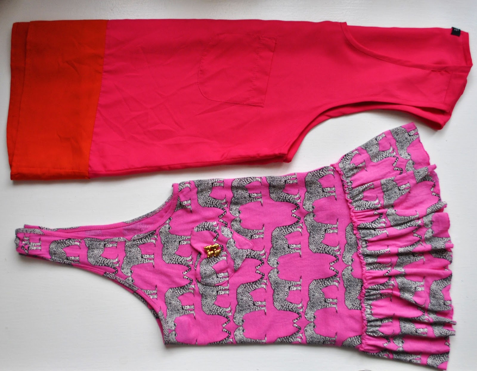 Ale väčšiu časť úlovkov, ktoré vám dnes predstavím tvoria úžasné sekáčové nálezy z posledných dní. Stále ma neprestalo baviť chodiť po secondhandoch a objavovať skryté poklady. Je to pre mňa v podstate taký menší adrenalínový (a endorfínový) šport. No radšej by som mala prestať trepať blbosti a namiesto toho vám povedať čo som si to vlastne kúpila. Prvý ružovo-oranžový top bol ešte s visačkou a je fakt úplne ľahučký, príjemný a na leto ideálny. Tiež sa mi na ňom páči malá kapsička a jemná asymetrickosť (vzadu je trošku dlhší). Druhým ružovým parťákom je tygrí top s najrozkošnejším srdiečkovým vreckom, na ktorom sú ešte malé mašličkové gombíky (to vám asi budem musieť odfotiť detailne, pretože je to fakt ňuňu). A čo, že je o pár čísel vačší! V lete mám predsa voľné a vzdušné veci aj tak najradšej.