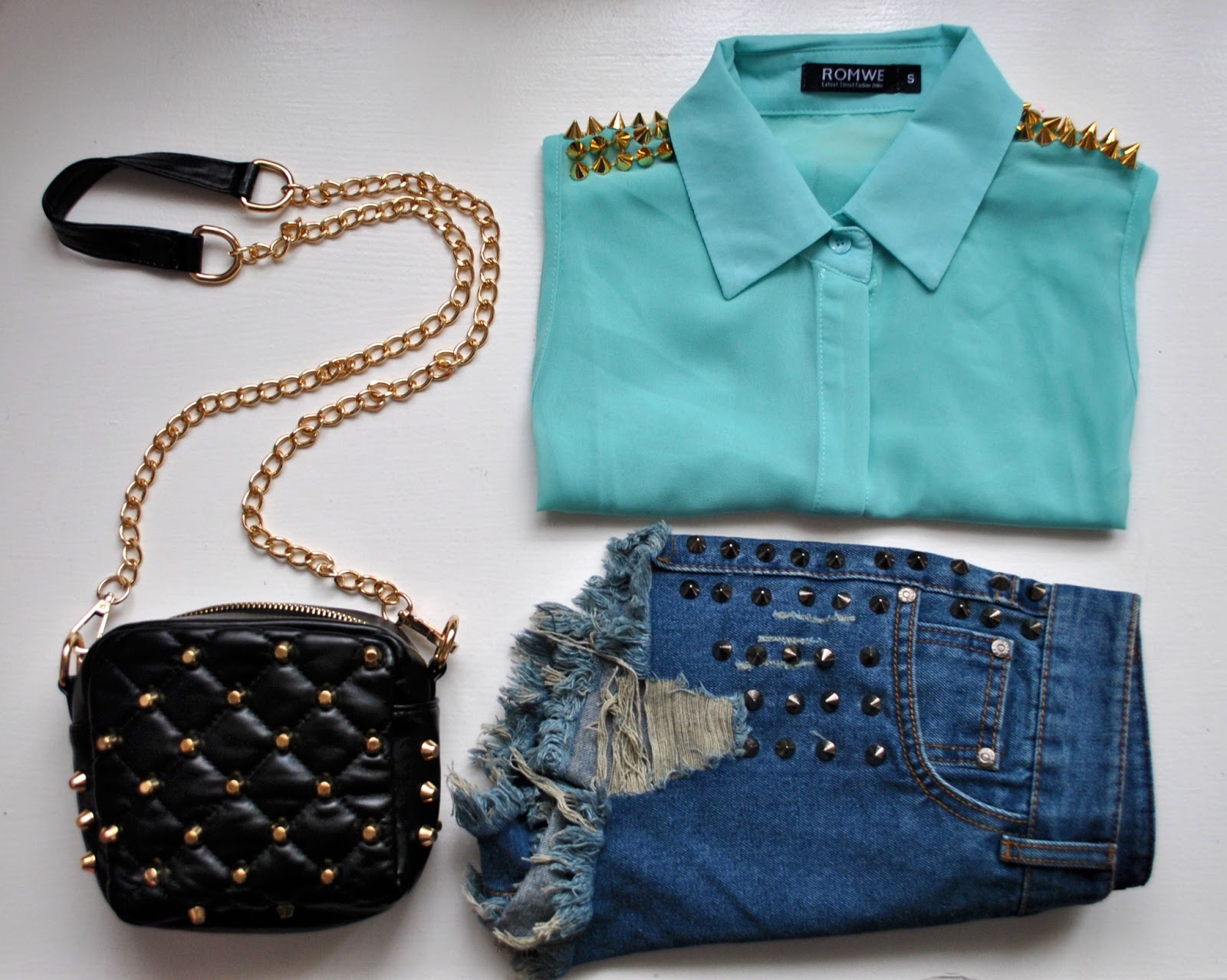 Romwe, ktorý ma veľmi príjemne prekvapil. Nielen, že všetko prišlo úplne perfektne zabalené(fakt asi najlepšie zo všetkých e-shopov čo som zatiaľ skúšala), ale veci sú v skutočnosti ešte o dosť krajšie ako na fotkách. Ako môžete vidieť, tak som si zhodou náhod vybrala všetko s ostňami/cvočkami/studs/volajtetoakochcete. Nad tými šortkami som zo začiatku celkom váhala(ale boli v zľave a posledné v mojom čísle, tak som ich hneď hodila do košíka), no nakoniec mi skvele sadnú a k jednoduchým topom či košeliam budú podľa mňa ideálne. Malá čierna kabelka mi chýbala už dlho a táto so zlatými ostňami je taká rozkošne drsňácka. Veľmi sa mi na nej páči aj tá retiazka a už sa teším ako ju vyvetrám. No a do tretice mint košeľa so zlatými pichliačmi na ramenách. Tá ma hneď upútala svojou farbou a tie ostne sú príjemným oživením.