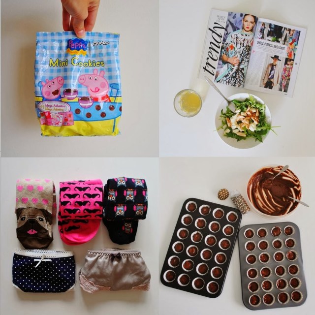 Ahojte! Prinášam už tretí mix mojich posledných dní, ktoré sa niesli (okrem tých bežných školsko-pracovných povinností) predovšetkým v duchu varenia, pečenia, oslavovania a bicyklovania, čiže presne tak ako to mám rada! Neverím, že to je už mesiac čo som svoje kapkejky predávala na Malom trhu, no odvtedy som ich už stihla pár upiecť aj na kamarátkinu oslavu narodenín a zajtra pokračujem v pečení na piatkovú párty. To len tak, aby ste vedeli, že sa z toho teším (a ak by ste chceli niekto napiecť, pokojne sa ozvite, budem len rada). Medzitým všetkým som ale stihla aj kopec iných vecí, ako napríklad výmenu letného šatníka za ten jesennejší, návštevu na VŠVU, zoznámenie s mojim novým bájsiklom (na ktorom mi už stihla dvakrát spadnúť reťaz…ehm), taký menší nákup v Tescu (a paradajky to neboli), či upečenie lievancov na nedeľné raňajky do postele. Suma sumárum sa mám fajn.