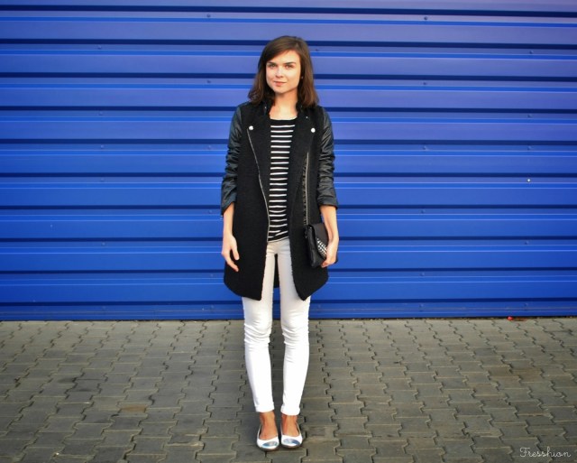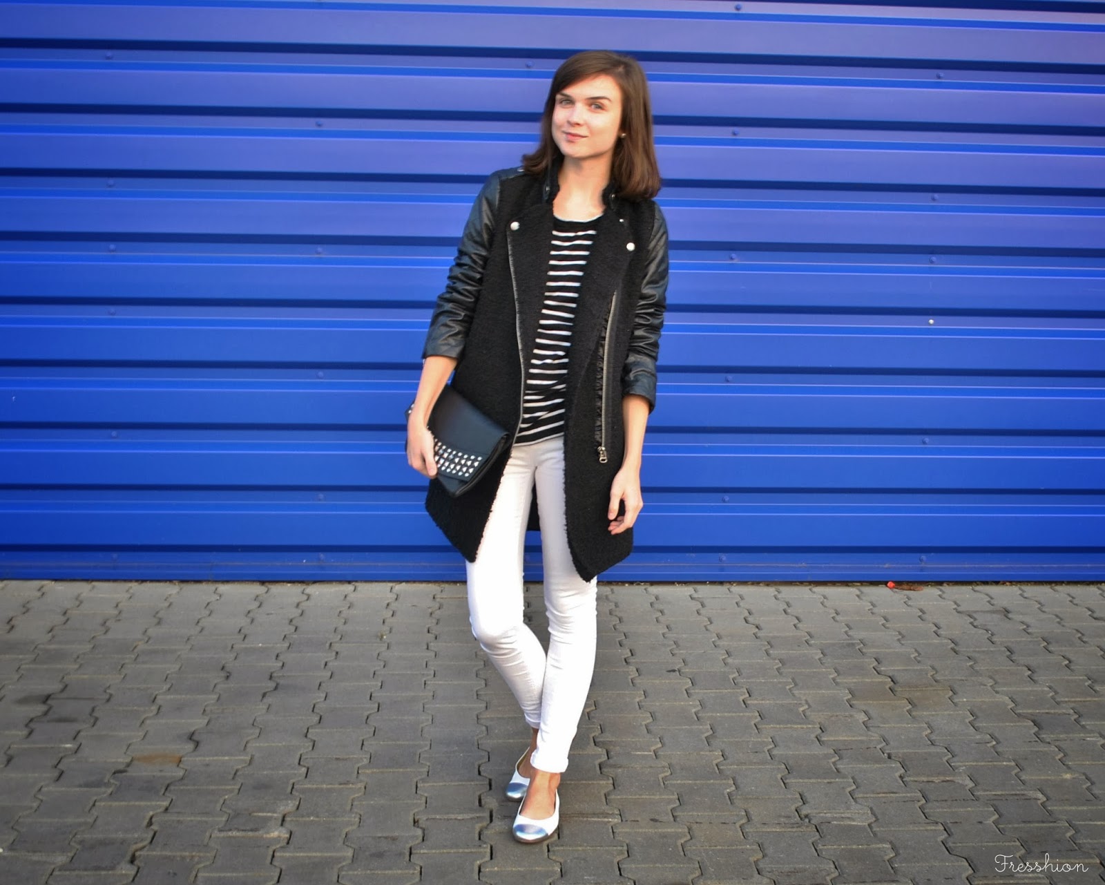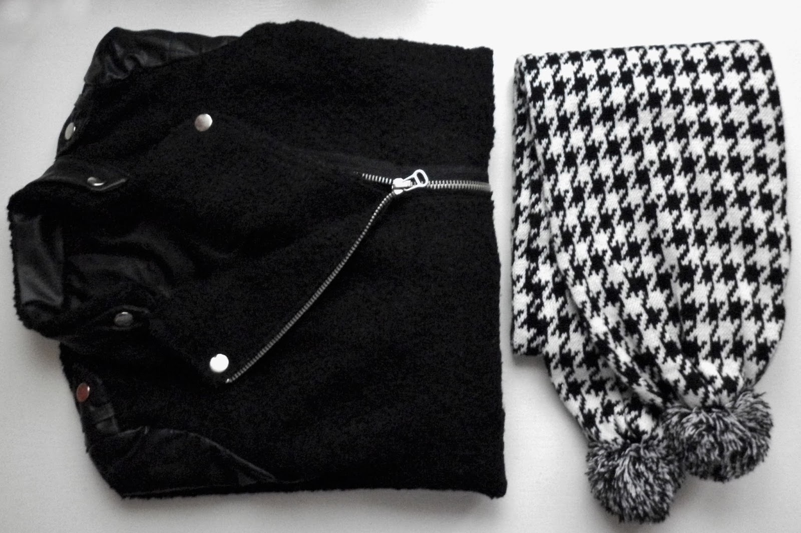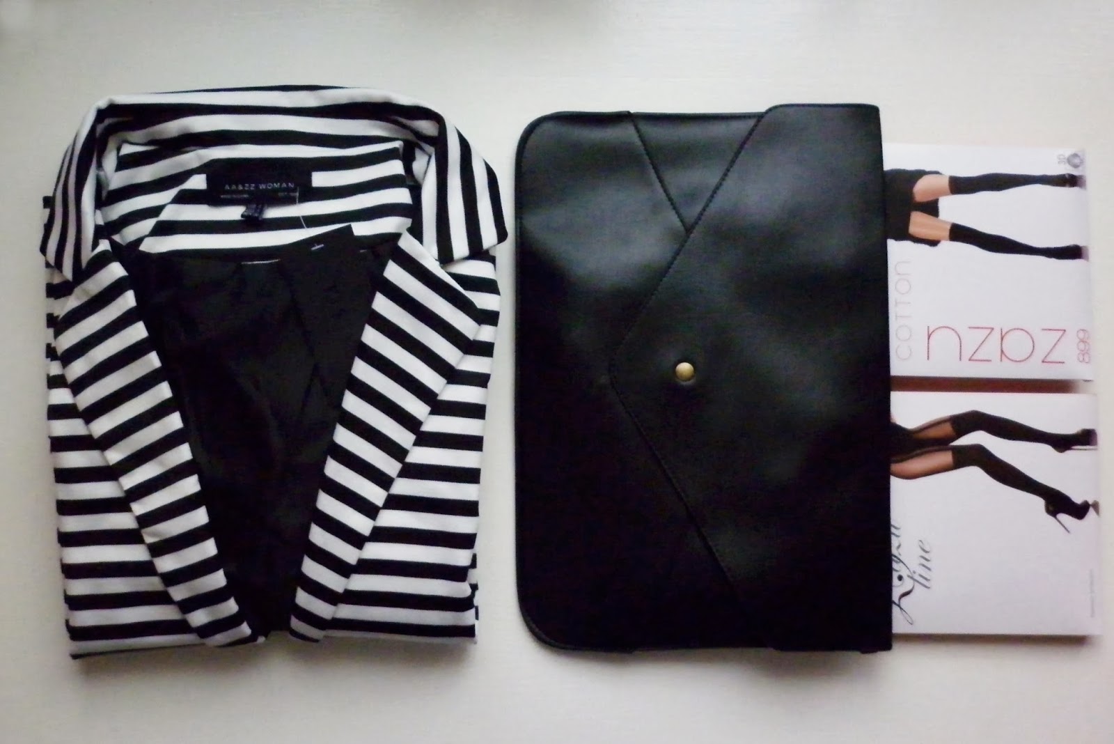 Sľúbila som new-in, tak teda tramtadadá! Vonku je momentálne šero a prší (čo je ten najlepší čas na písanie príspevku, aj keď sa to trošku odrazilo na kvalite fotiek..ehm), takže som vám nafotila zopár vecí, ktoré si ku mne v poslednom čase našli cestu. Nie je to úplne kompletné pretože momentálne som doma a niečo mám v Bratislave (to je tak keď bývate na dvoch miestach), ale ukážem vám to tak či tak. Začnem mačičkovou šatkou, ktorá je z toho najpríjemnejšieho materiálu a výborne sa hodí k novým čižmám, ktoré si mamina priniesla zo španielskej Zary (a ktoré si budem určite často požičiavať, ďakujem mami!). Je super, že máme rovnakú veľkosť topánok. Biely svetrík na fotke som tiež dostala od nej a je super mäkučký s výšivkou na ramenách. Ako stvorený na také tie dni, keď sa mi nechce vymýšľať čo na seba. Tiež to poznáte? No a zvyšok vecí je prekvapivo čierno-biely. V poslednom čase sa moje farebné spektrum trošku minimalizuje, aj keď v outfitoch sa to vždy snažím podčiarknuť nejakou výraznejšiou farbou, takže od hlavy po päty v čiernej ma asi neuvidíte, nebojte! A čo to tu teda mám? Pruhované sako som chcela už celú večnosť a myslím, že som konečne našla to pravé. Asi viete, že túto listovú kabelku mám už v červenej a je taká skvelá, že som ju musela mať aj v čiernej (a žltej..ehm). No a kabát ste už videli v poslednom príspevku a je to láska. Bude ladiť aj s tým šálom s kohútiou stopou,nemyslíte?
