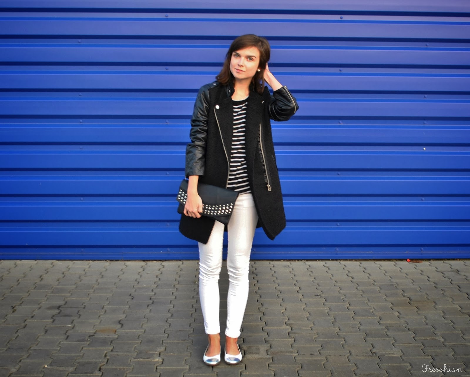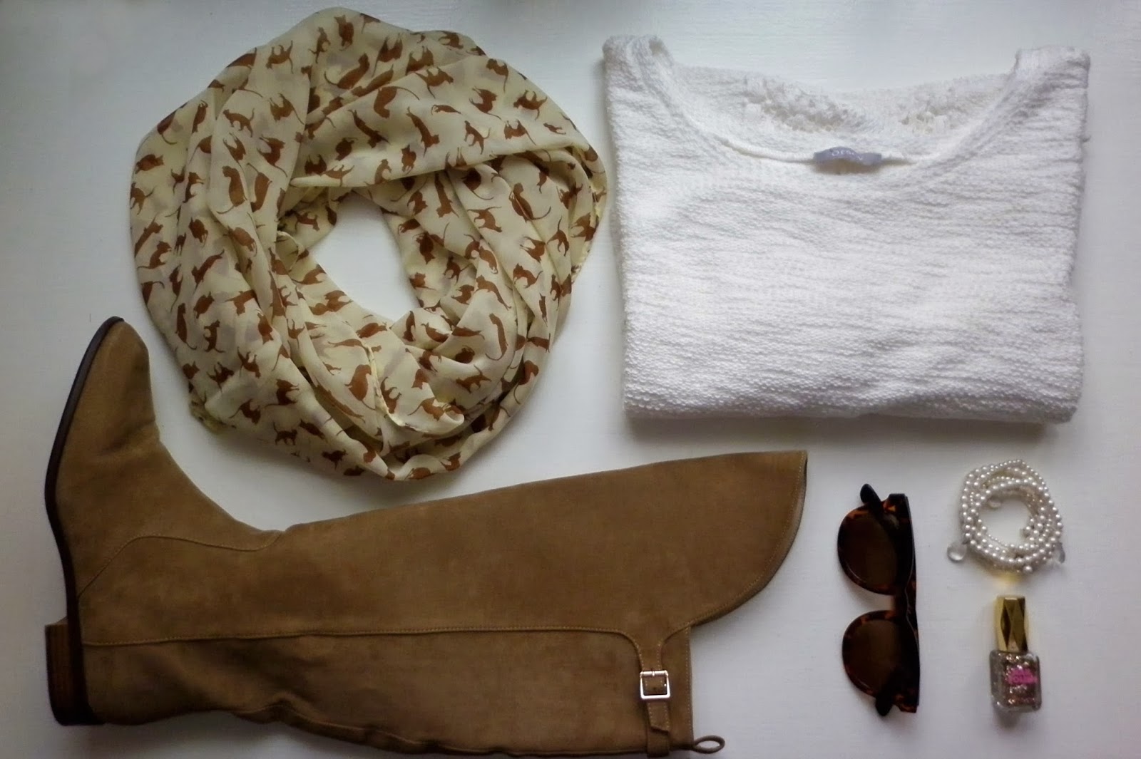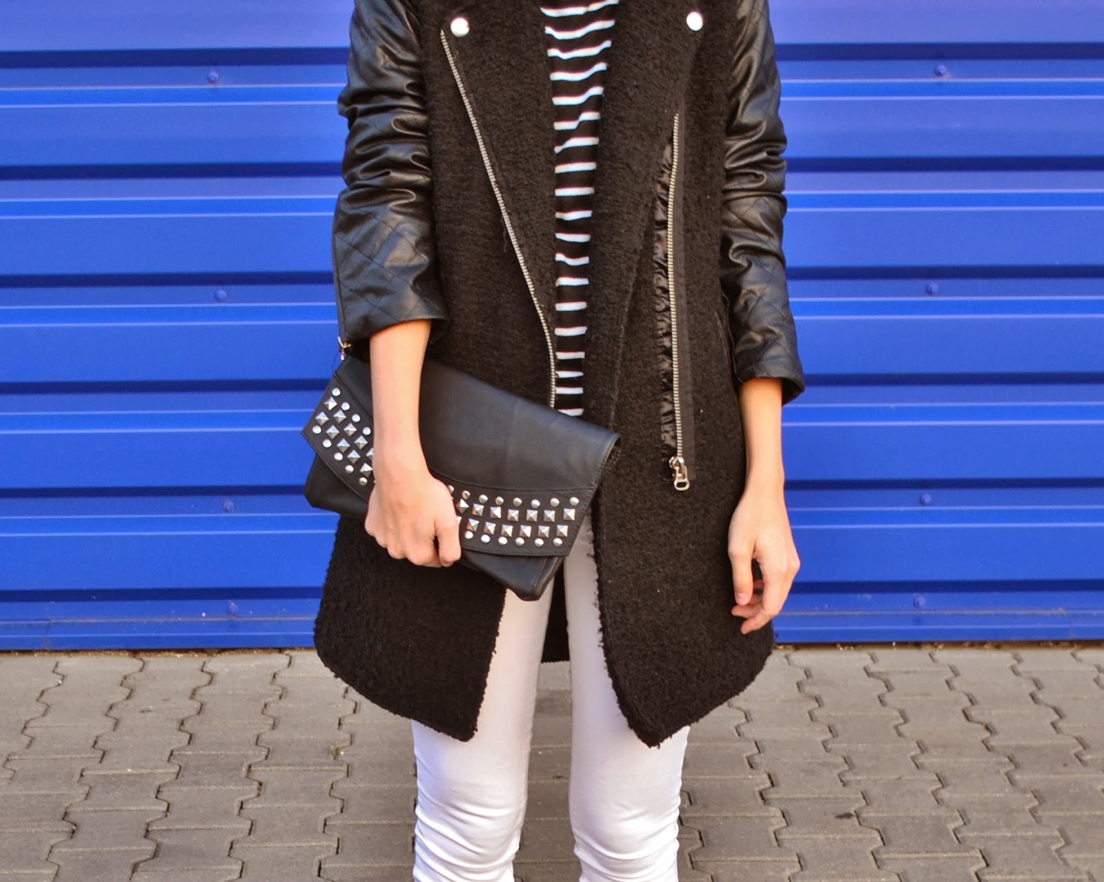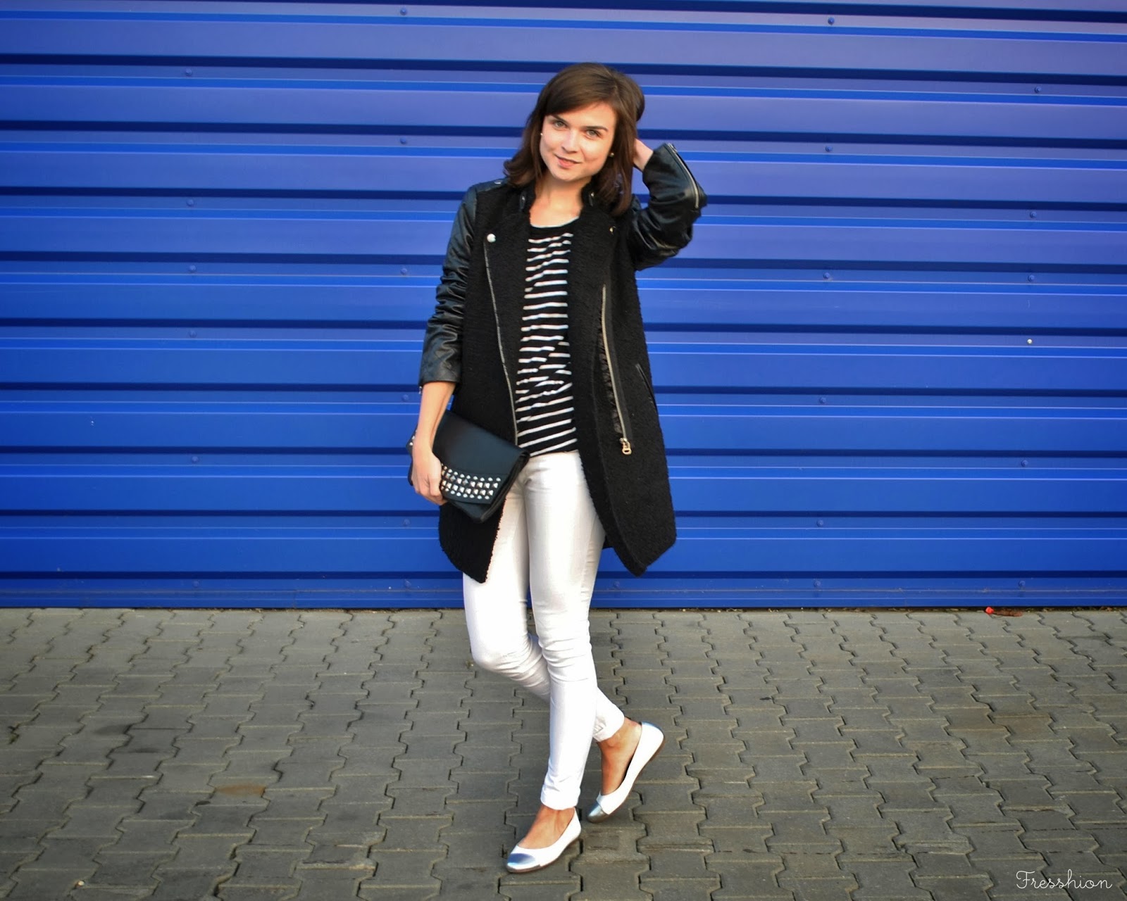 Sľúbila som new-in, tak teda tramtadadá! Vonku je momentálne šero a prší (čo je ten najlepší čas na písanie príspevku, aj keď sa to trošku odrazilo na kvalite fotiek..ehm), takže som vám nafotila zopár vecí, ktoré si ku mne v poslednom čase našli cestu. Nie je to úplne kompletné pretože momentálne som doma a niečo mám v Bratislave (to je tak keď bývate na dvoch miestach), ale ukážem vám to tak či tak. Začnem mačičkovou šatkou, ktorá je z toho najpríjemnejšieho materiálu a výborne sa hodí k novým čižmám, ktoré si mamina priniesla zo španielskej Zary (a ktoré si budem určite často požičiavať, ďakujem mami!). Je super, že máme rovnakú veľkosť topánok. Biely svetrík na fotke som tiež dostala od nej a je super mäkučký s výšivkou na ramenách. Ako stvorený na také tie dni, keď sa mi nechce vymýšľať čo na seba. Tiež to poznáte? No a zvyšok vecí je prekvapivo čierno-biely. V poslednom čase sa moje farebné spektrum trošku minimalizuje, aj keď v outfitoch sa to vždy snažím podčiarknuť nejakou výraznejšiou farbou, takže od hlavy po päty v čiernej ma asi neuvidíte, nebojte! A čo to tu teda mám? Pruhované sako som chcela už celú večnosť a myslím, že som konečne našla to pravé. Asi viete, že túto listovú kabelku mám už v červenej a je taká skvelá, že som ju musela mať aj v čiernej (a žltej..ehm). No a kabát ste už videli v poslednom príspevku a je to láska. Bude ladiť aj s tým šálom s kohútiou stopou,nemyslíte?