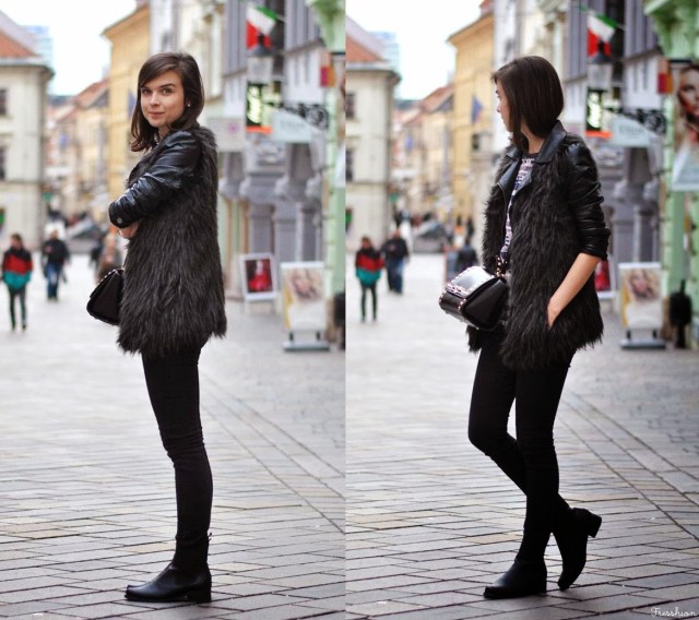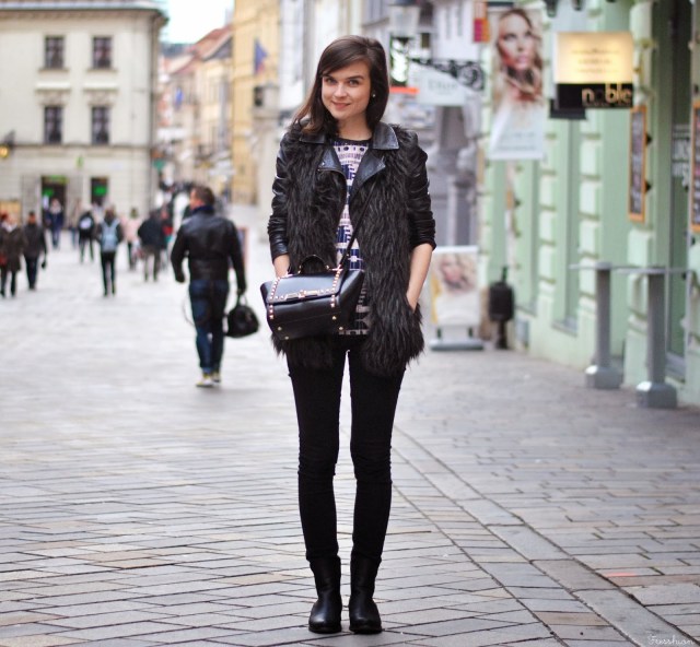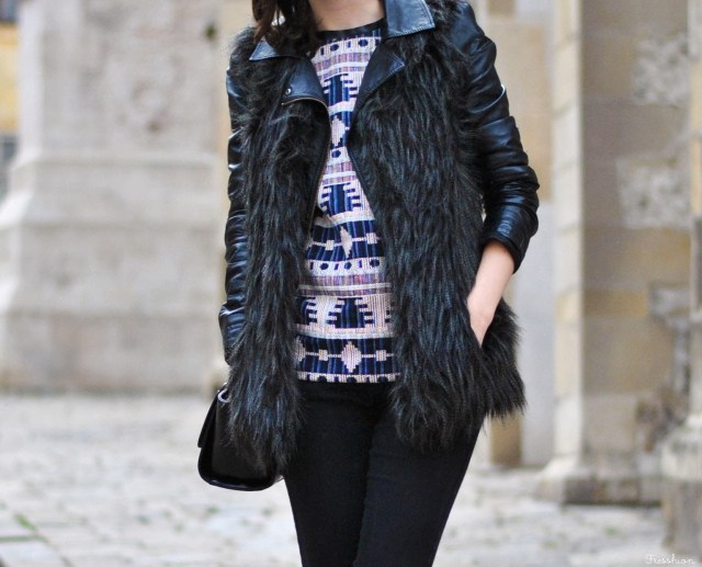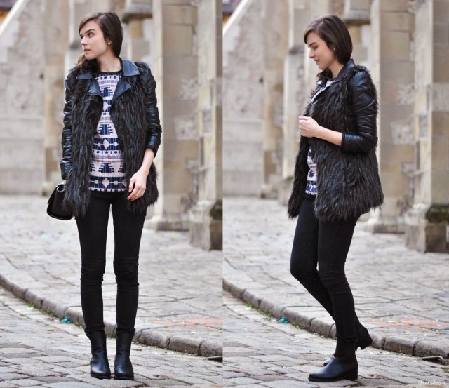 Tento mikino-sveter som si objednala s tým, že to budú šaty, no s ich dĺžkou to na ne vôbec nevyzerá (na fotke ich mám síce kúsok zahnuté dovnútra, ale aj tak). Nevadí. Pravdu povediac sa mi možno takto páčia ešte viac. Dlho som rozmýšľala s čím tento aztécky vzor skombinujem, no nakoniec to vyhral pre-mňa-trošku-netypický celo-čierny outfit (aj keď tie džínsy sú v skutočnosti tmavosivé). V koženej bundičke, na ktorú som si obliekla ešte kožušinovú vestu, v nových topánkach (suvenír z Paríža) a s vybíjanou kabelkou som sa cítila tak drsňácky :) Čo vy na to? Môže byť či sa Vám viac páčim v sukni a s mašľou vo vlasoch? Som zvedavá na Vaše názory!