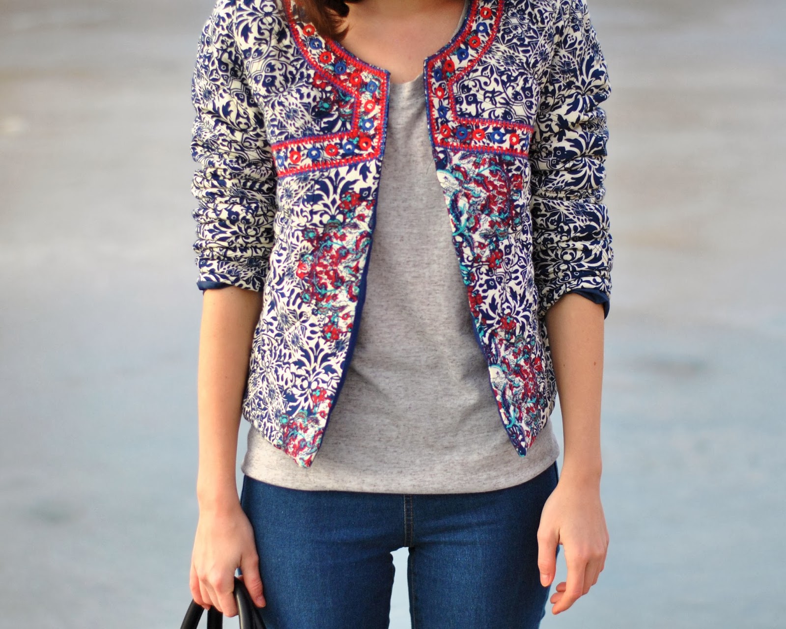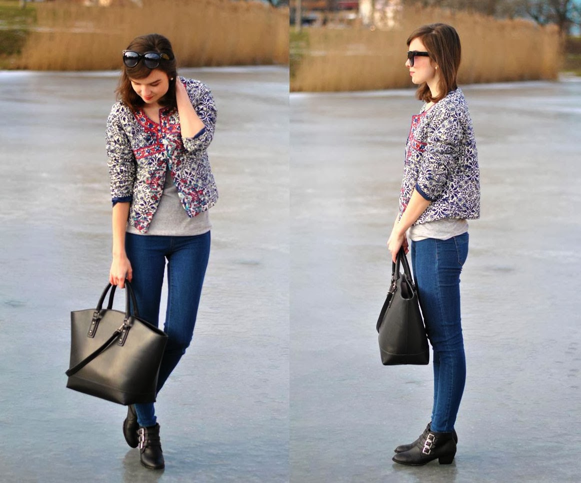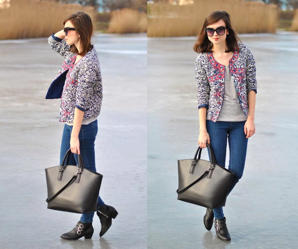Bonjour! Som späť z Paríža, no dnes ešte s predparížským outfitom. S touto bundou to bolo veľmi jednoduché. Zazrela som ju, zamilovala som sa do nej a vedela som, že ju musím mať. Po jej príchode ma prekvapilo aká je príjemne mäkučká a aj ten porcelánový vzor bol v skutočnosti ešte krajší ako na fotkách. Keďže je ale sama o sebe celkom výrazná, skombinovala som ju so svetlejšími džínsami, jednoduchým tričkom, čiernymi doplnkami a vznikol z toho taký pohodový/pohodlný outfit. Mimochodom, uhádnete kde sme to fotili? Na ľade(!!)a bolo to asi zatiaľ jedno z najadrenalínovejších fotení(keďže pár metrov od nás už bola voda),ale nebojte, neutopili sme sa!