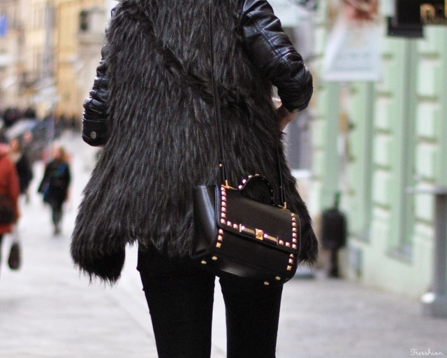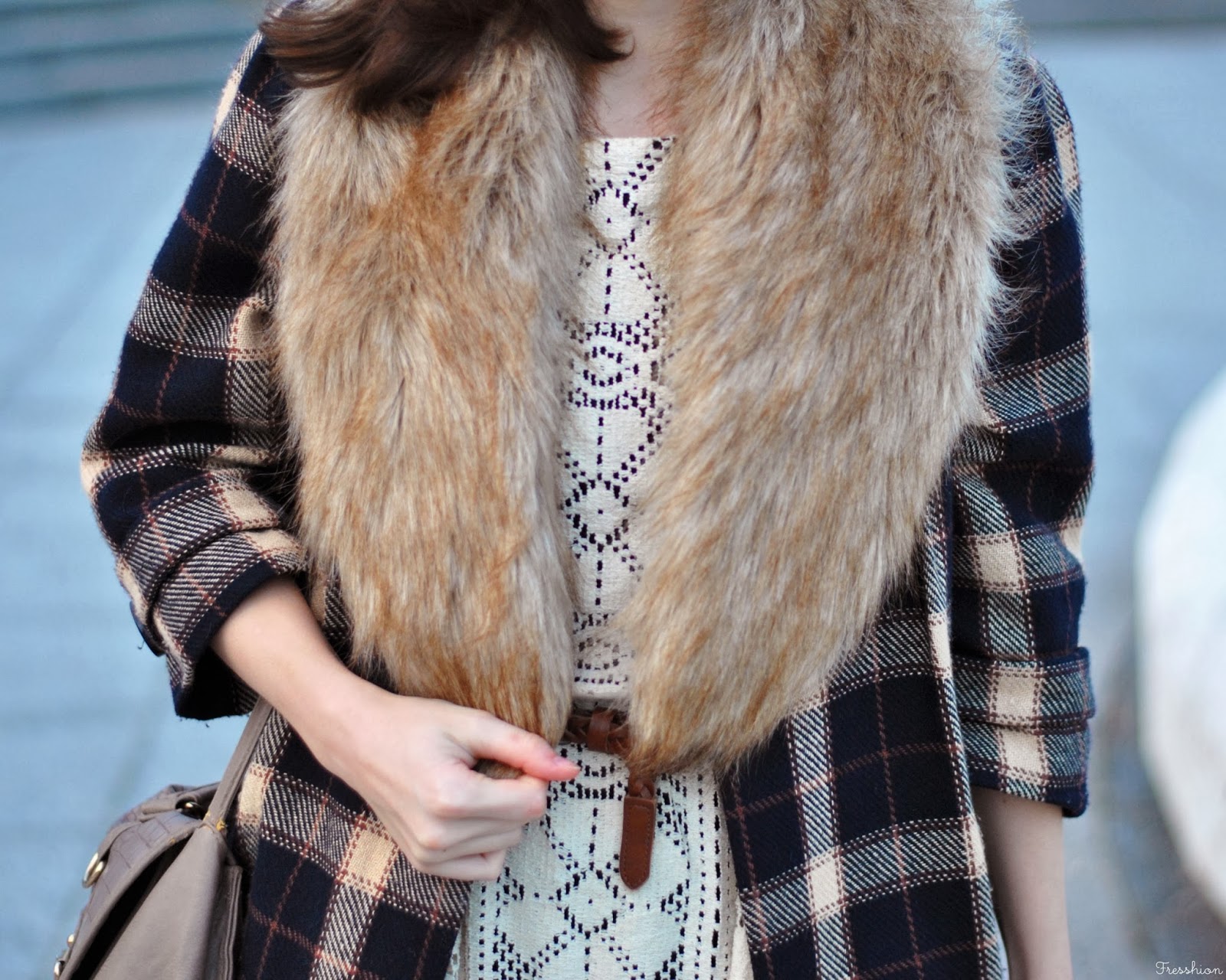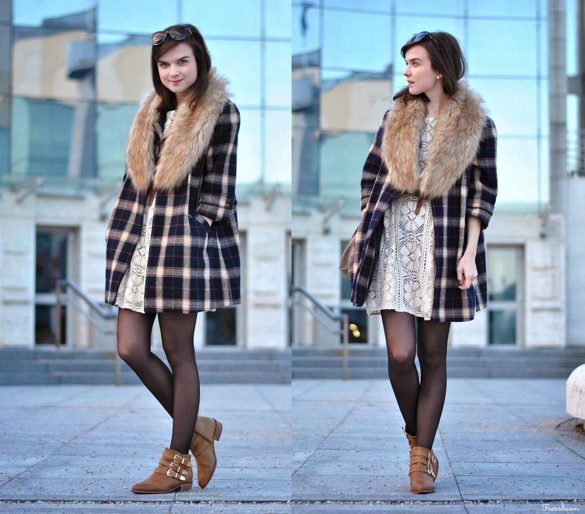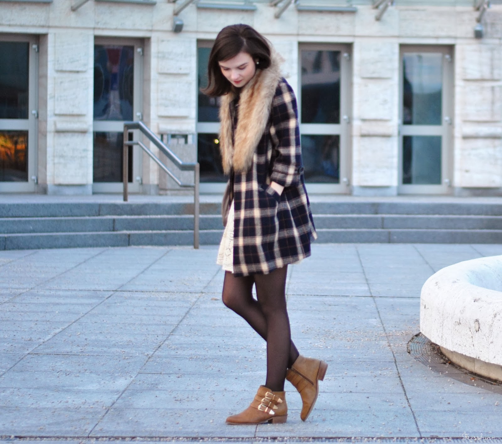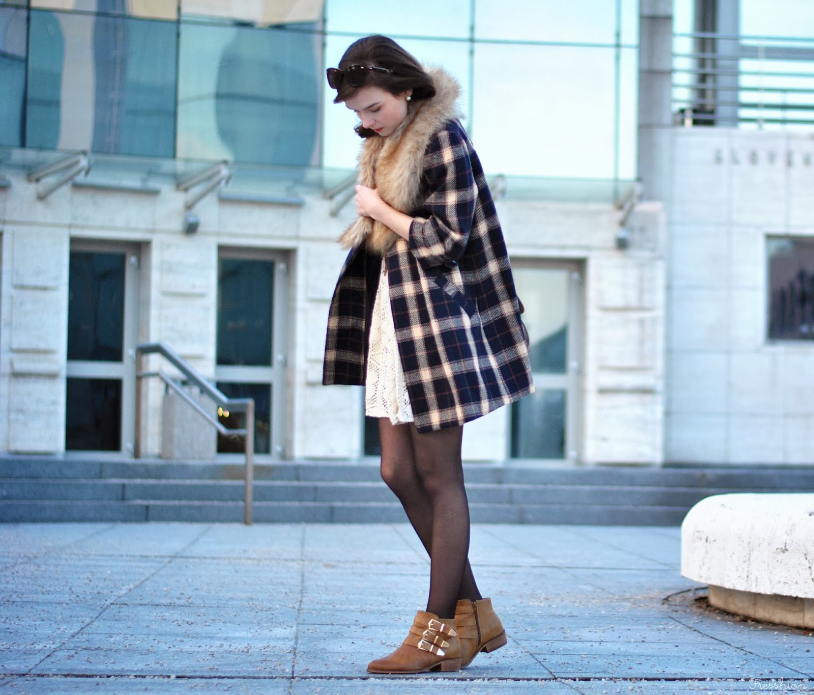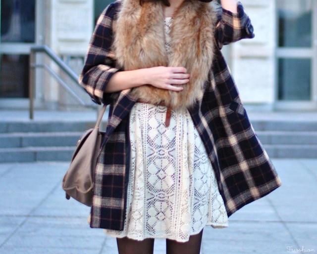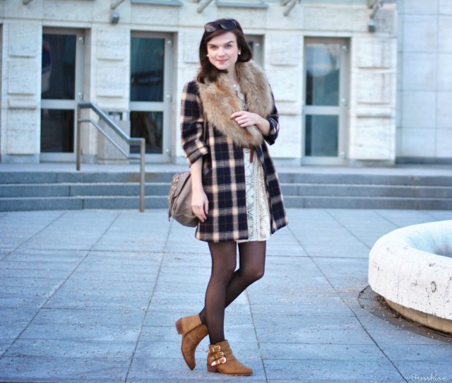 Vo štvrtok som sa cítila už skoro jarne. Až tak, že mi stačili iba tenké silonky, krajkové šaty (tie, v ktorých som maturovala), károvaný kabátik a slnečné okuliare. Avšak keď to slnko neskôr zašlo, už nebolo úplne najteplejšie a bola som celá rada, že som si zobrala aj túto kožušinku, ktorá ma príjemne zahriala. Celé som to doplnila novými čižmičkami z topánkova, do ktorých som sa zaľúbila na prvý pohľad aj obutie! Môžem povedať, že sú naozaj pohodlné, tiež sa mi veľmi páčia ich zlaté detaily a v hlave už mám asi milión kombinácii čo k nim.