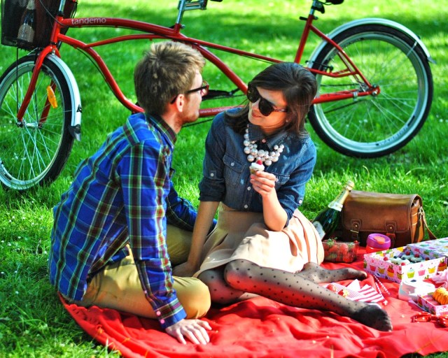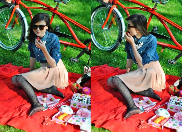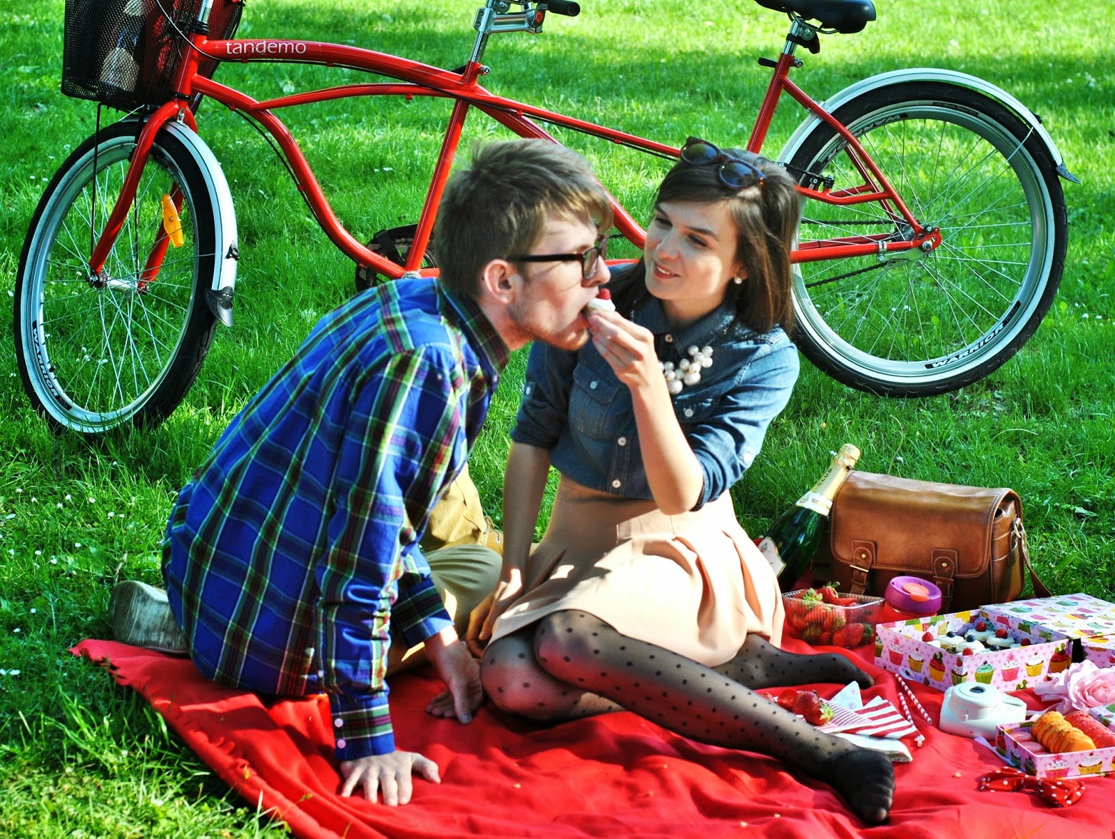 básnila o tandemovom bycikli? Tak sme minulý týždeň neodolali a požičali si ho znova. Tentokrát sme sa previezli do parku, zaparkovali pod stromom, rozprestreli deku a užívali si okrem krásneho počasia aj dobroty, ktoré som napiekla. Makrónky s karamelovým krémom, na ktoré som doteraz pyšná, pretože sa mi podarili ako ešte nikdy. Niektorí ochutnávači dokonca tvrdili, že môžu smelo konkurovať tým parížskym, čo je pre mňa tá najväčšia pochvala. Po makrónkach sme sa kŕmili kapkejkami, pozorovali oblohu a koruny stromov, fotili na polaroid, hľadali zvieratká v oblakoch a popíjali šampanské s jahodami. Nakoniec sme padli vyčerpaním z toho