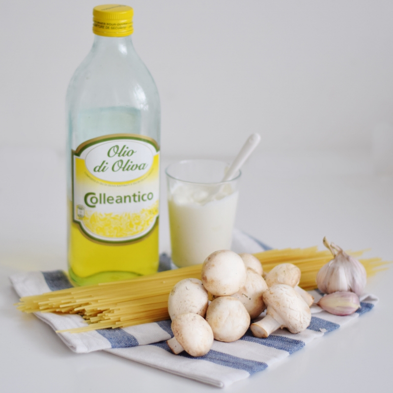 na špagety s krémovou hubovou omáčkou potrebujeme: šampiňóny, špagety, kúsok masla, olivový olej, 2-3 strúčiky cesnaku, asi pol téglika kyslej smotany, čierne korenie a soľ