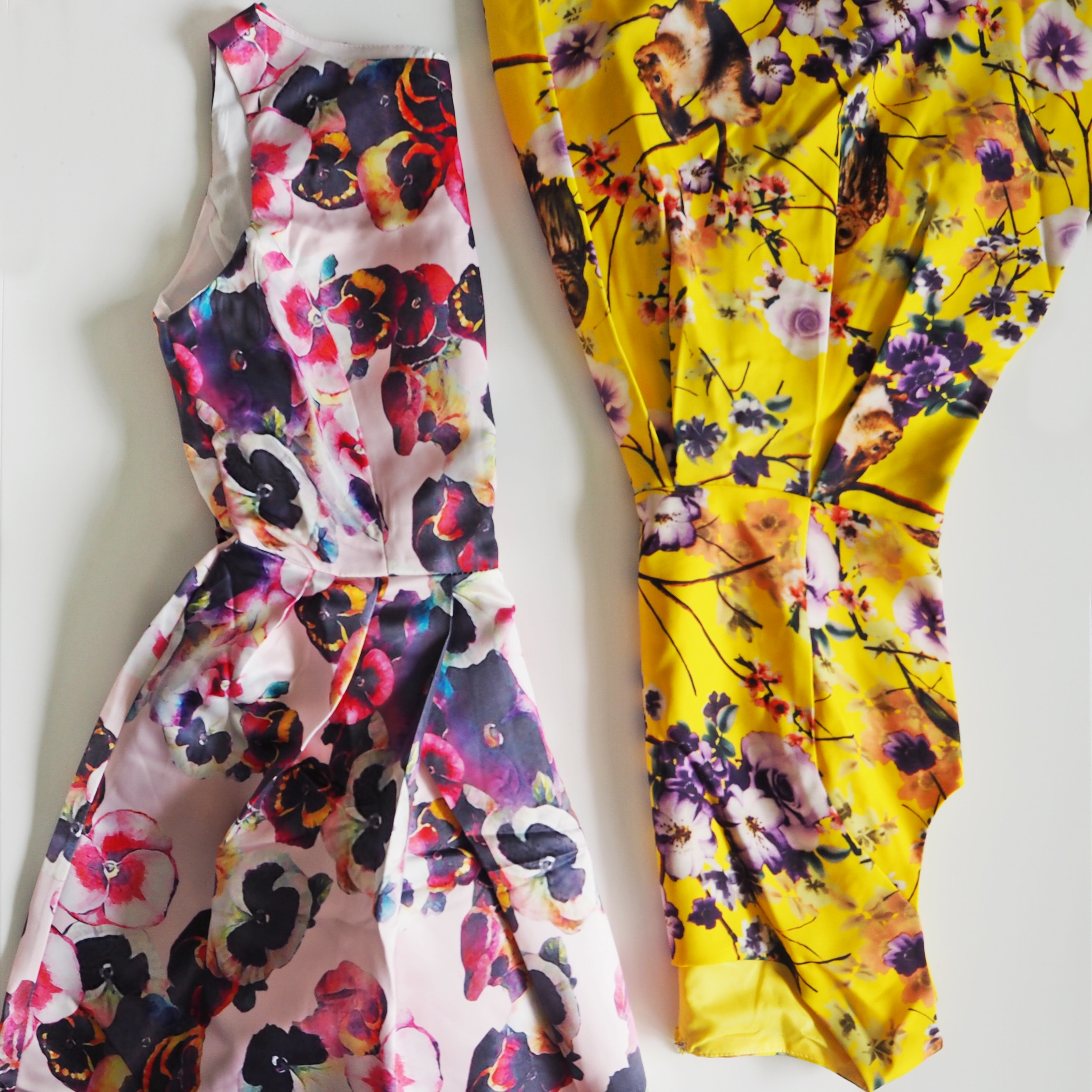 pink floral dress, yellow owl print dress – Shein