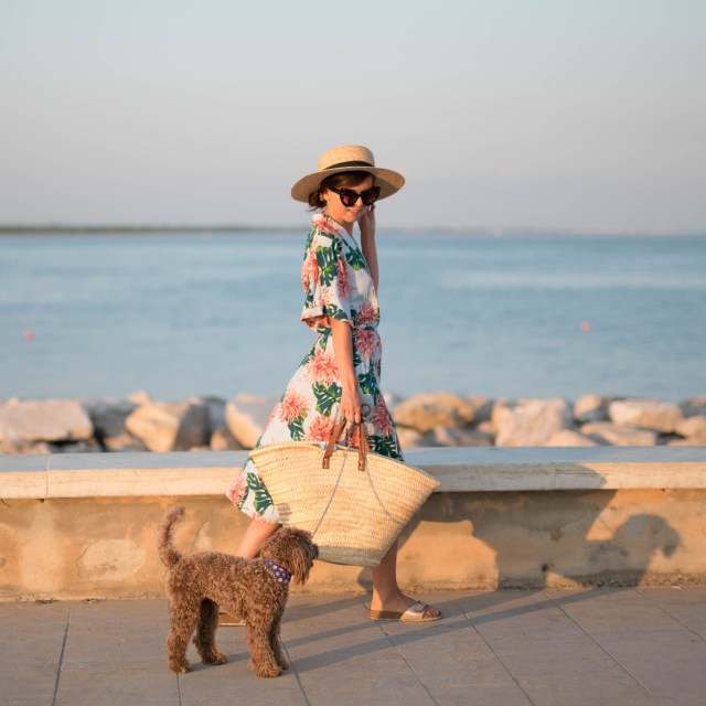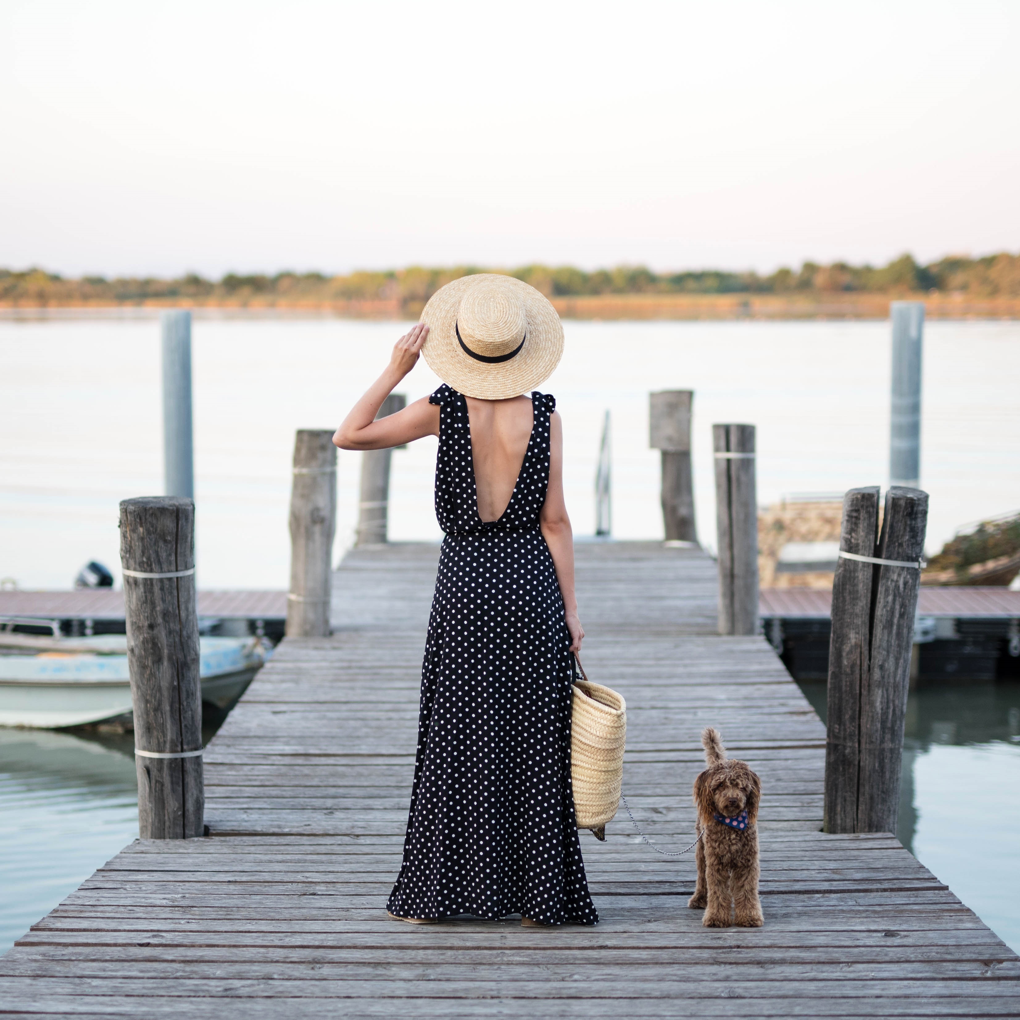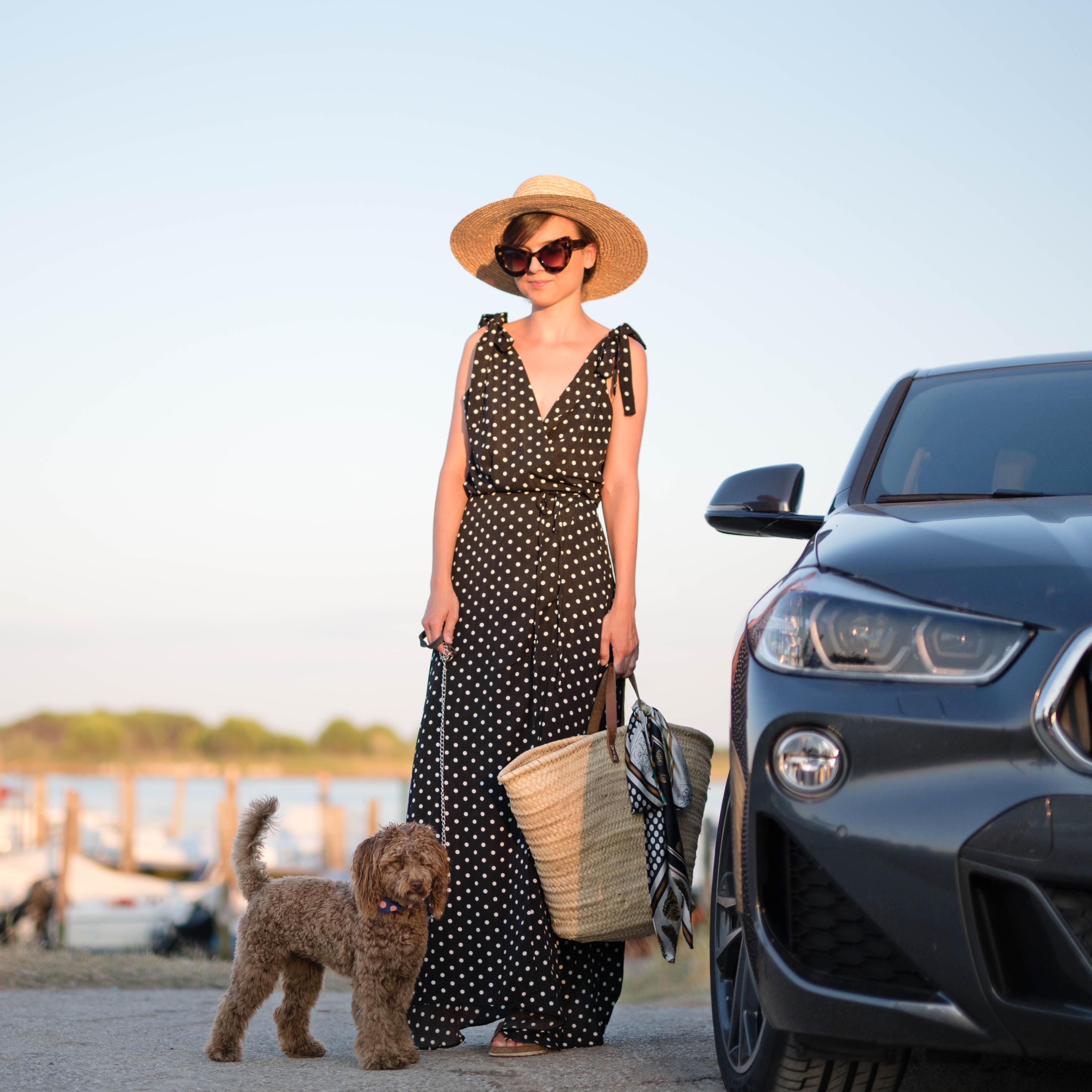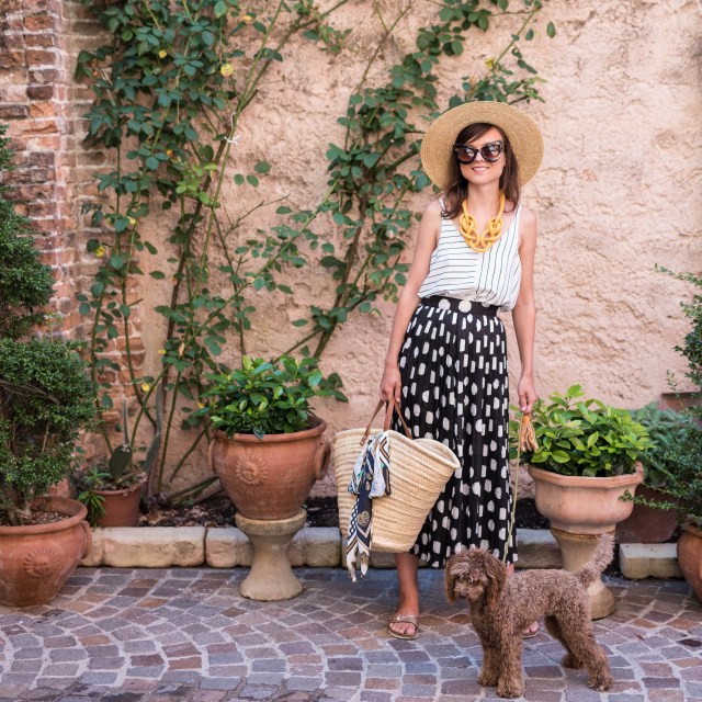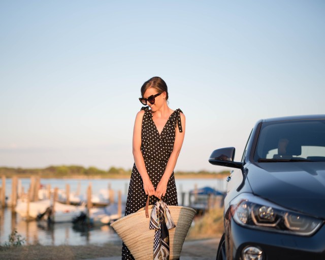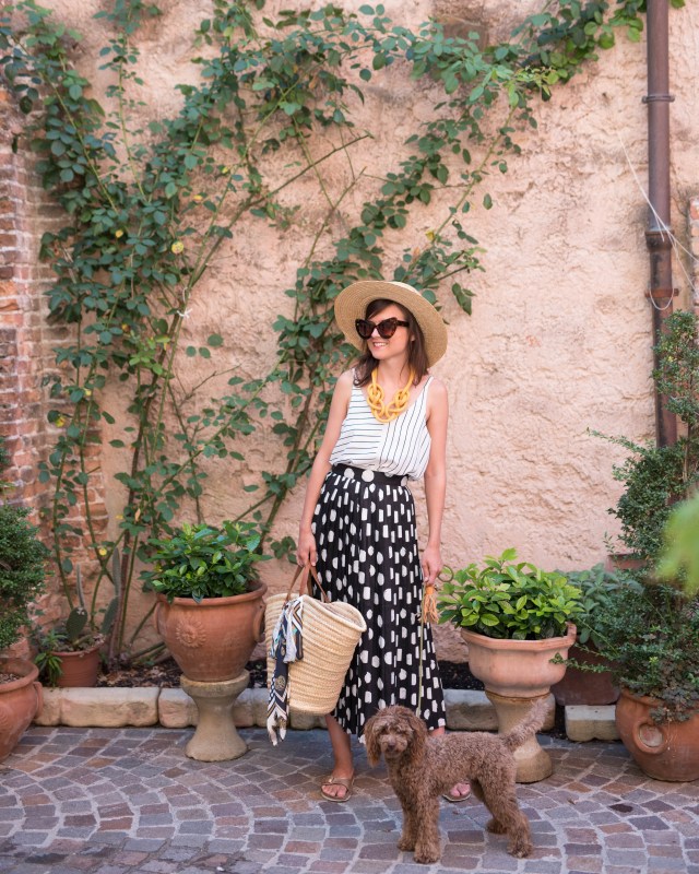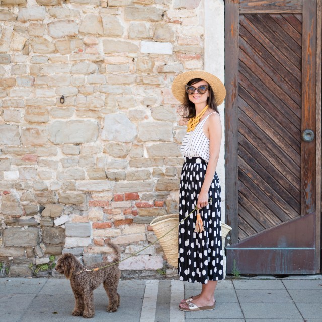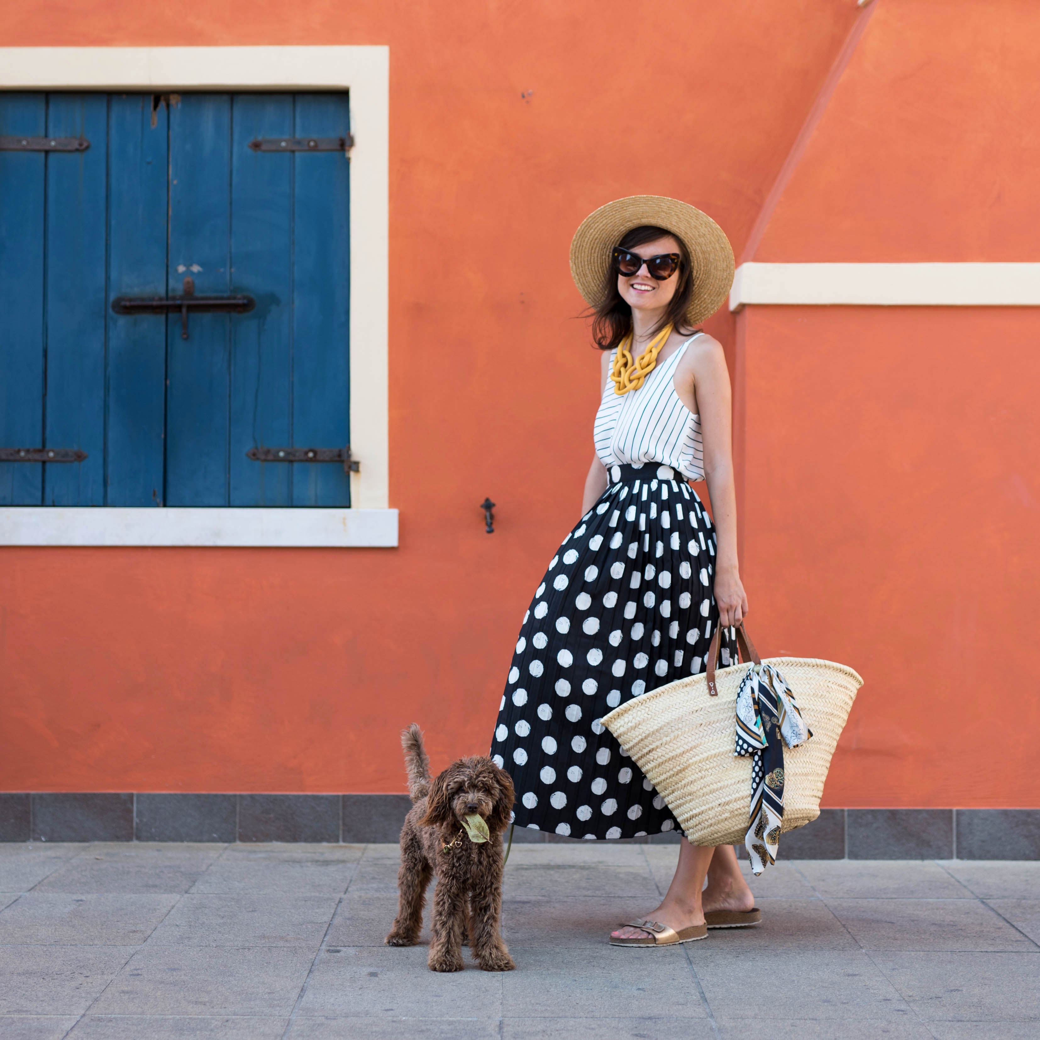 bodkovaná blúzka, malý slamený košík – Bonprix / džínsy – H&M / topánky – Birkenstock z Office shoes