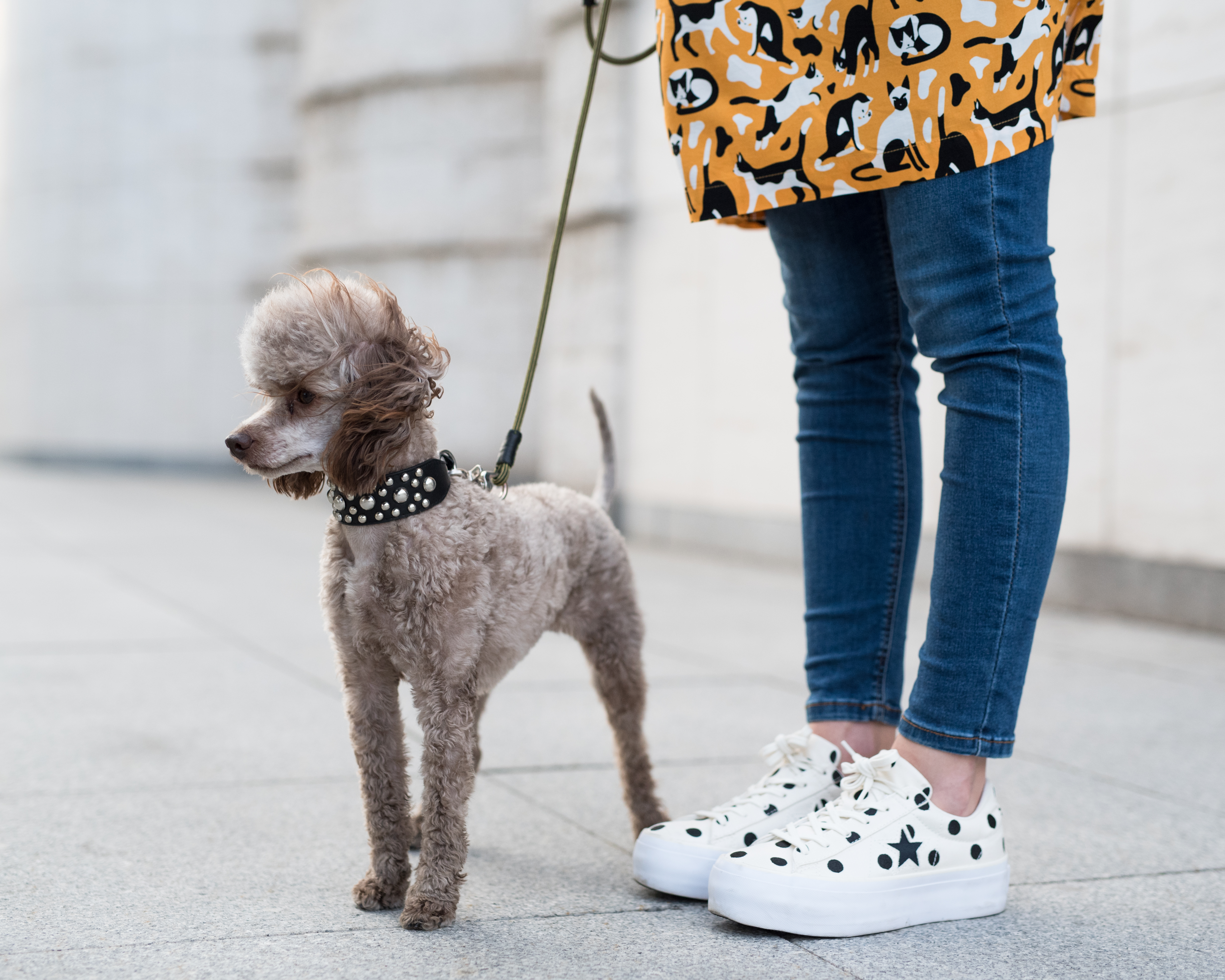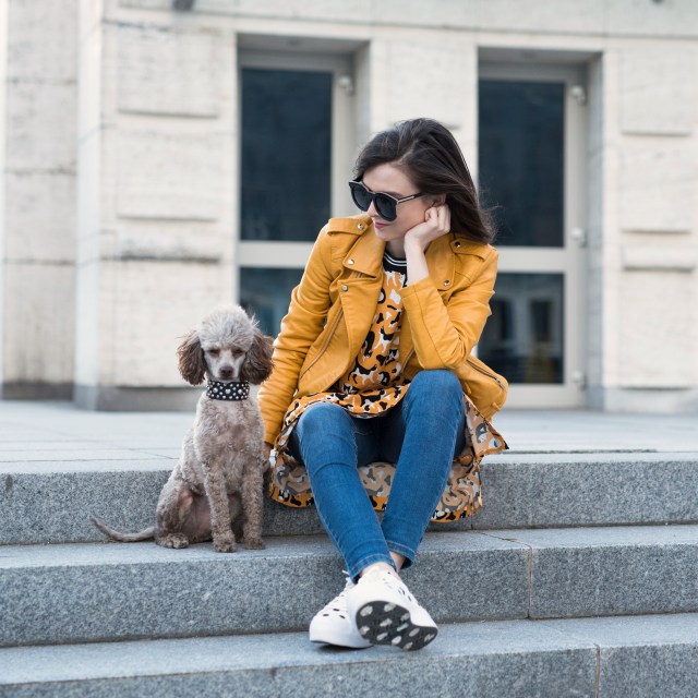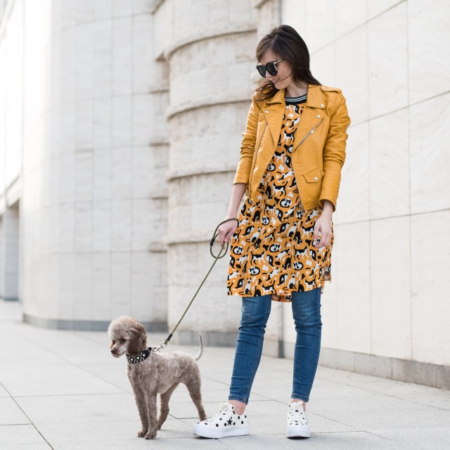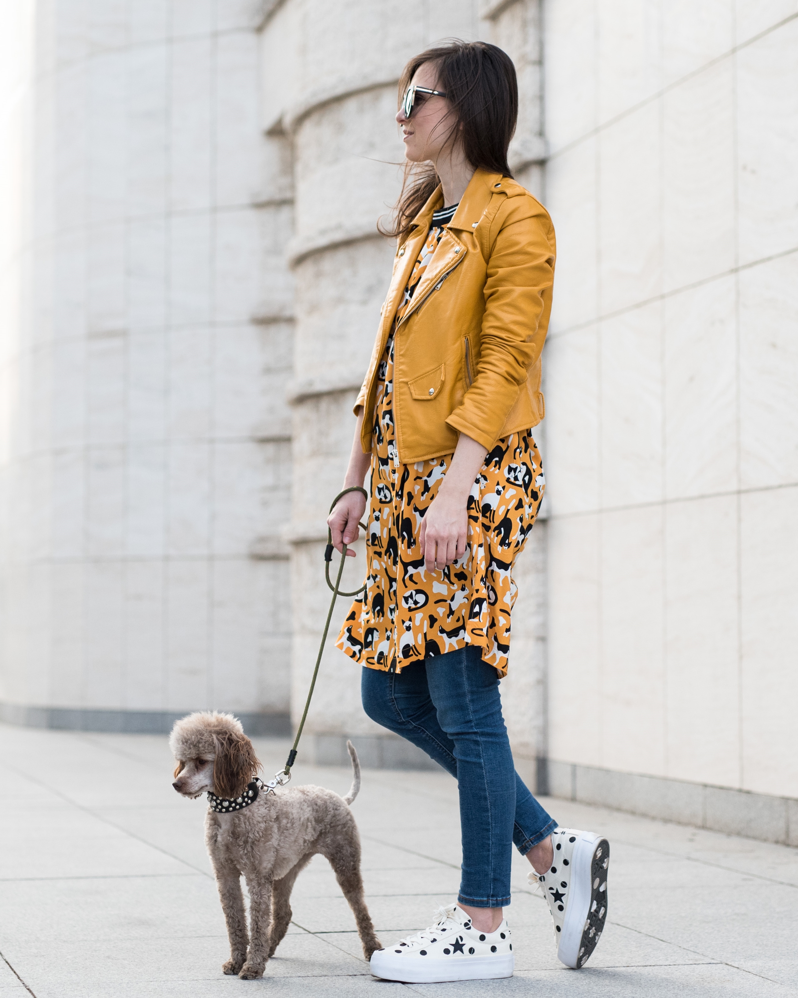 Ahojte! Aj vás to včerajšie parádne počasie nabilo a úplne naladilo na jar? Vôbec by som sa nesťažovala keby sme tých plus mínus 20 stupňov a slnečno (ako stvorené na holé členky, krátke rukávy či dokonca kraťasy, v ktorých hneď nabehli moji bratia) mali celoročne. Inak Amélie už vyfasovala jarný zostrih (keď sme si ju išli vyzdvihnúť do salóna a ona vybehla s novým imidžom, mali sme pocit, že nám vymenili psa :) ), ja som zahájila teniskovú sezónu a už teraz je jasné, že v týchto bodkovaných converskách ma uvidíte celkom často. Veľmi ma baví ich vyššia podrážka aj to, že sa napriek bodkám (ktoré sú aj zospodu, čo ma pri rozbaľovaní najviac potešilo #apřitomtakováblbost) hodia skoro ku všetkému. Aj k žltým šatám s mačkami. Tie ma nielen farbou (veď viete, že si frčím na žltej), ale aj rozkošnou potlačou zaujali na prvý pohľad a naschvál som si ich objednala o dve čísla väčšie, nech sú pekne oversized. No a majú aj vrecká, takže ideál! Teraz ich nosím s džínsami a bundou, no už sa neviem dočkať ako vybehnem len v nich.
